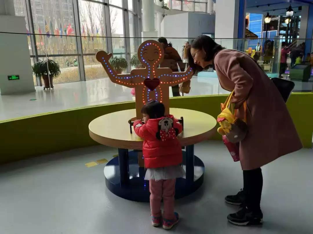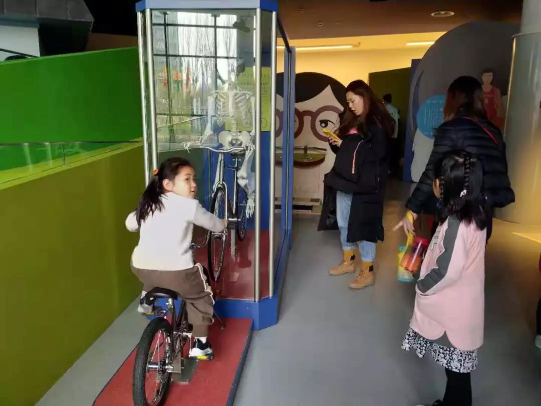 其次,除了上述模拟小场景的体验以外,还有一个认识自己展区,孩子们可以体验我们身体各个器官是如何运转的:比如拉动风箱看肺部呼吸、骑骨架单车观察骨骼如何协同作用等。将这些知识融入到孩子的玩耍中,可以激发孩子们的兴趣,让孩子们很轻松的认知。通过把高大上化繁为简,使幼儿园的孩子们更直观的理解展项背后的教育意义,这是“老牛馆”的又一大亮点。