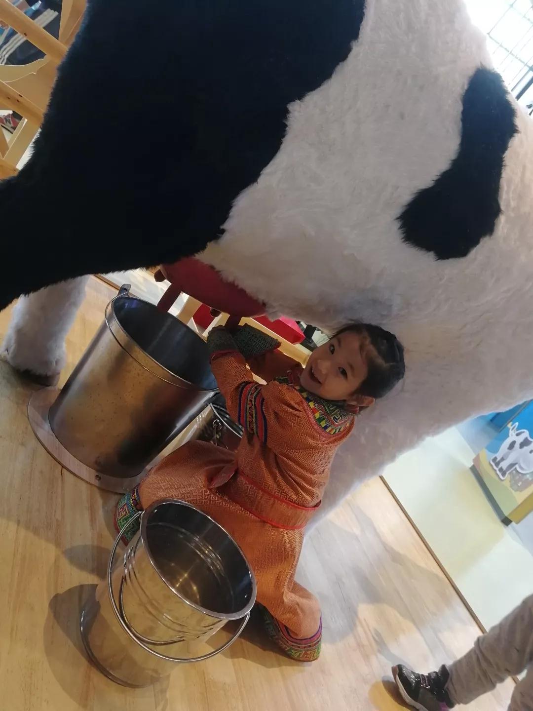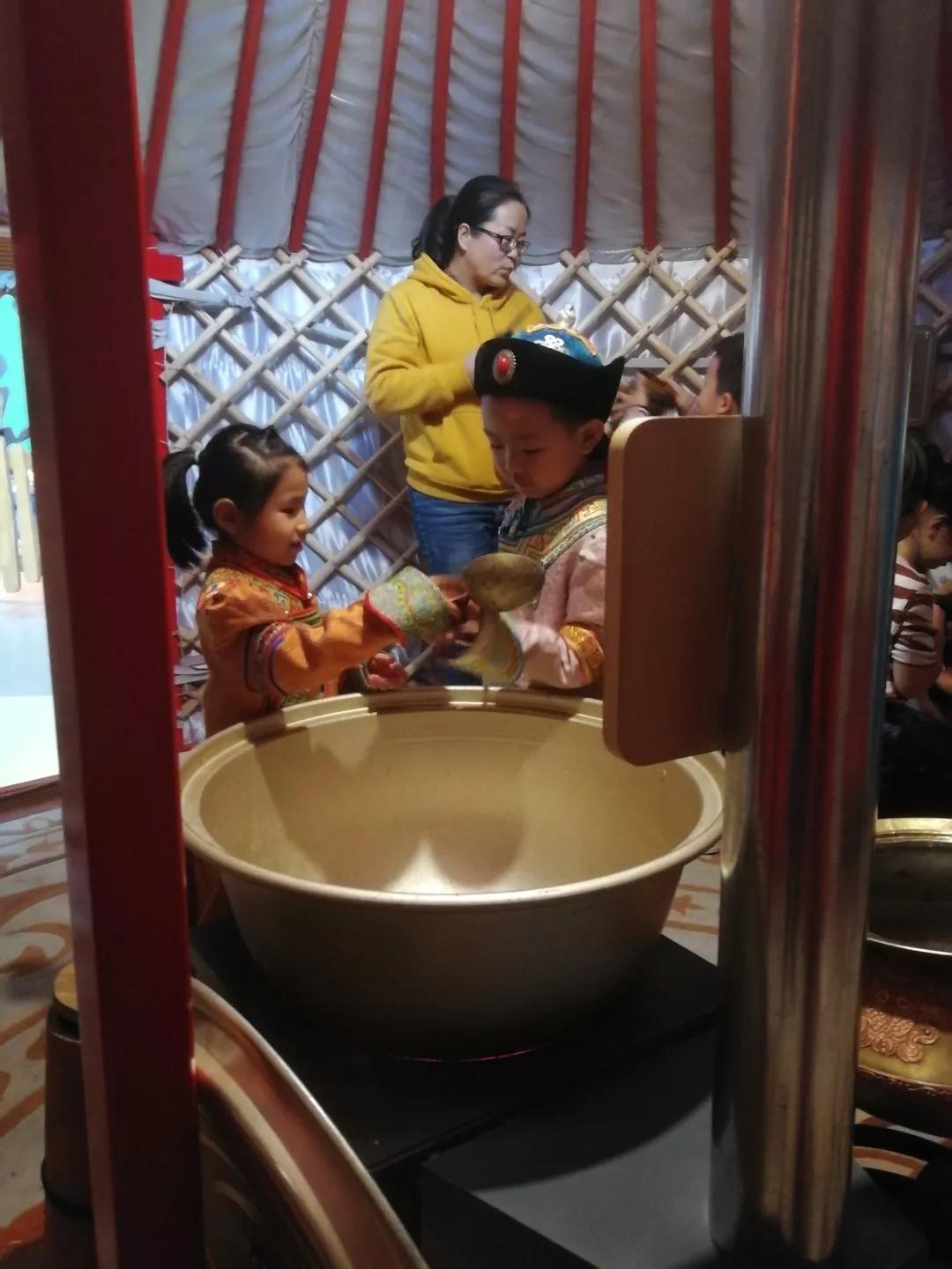 在二楼,就是具有草原特色的魅力草原展区了,进入到蒙古包里,陈设了一些牧区人民的生活用品,作为内蒙古自治区的孩子,当然要多了解一些蒙元文化了,孩子还有幸穿上了蒙古袍,体验了一下挤牛奶,以前也在书本上给她提及过一些草原文化小知识,通过这次切身的体验,相信孩子已经加深了印象。