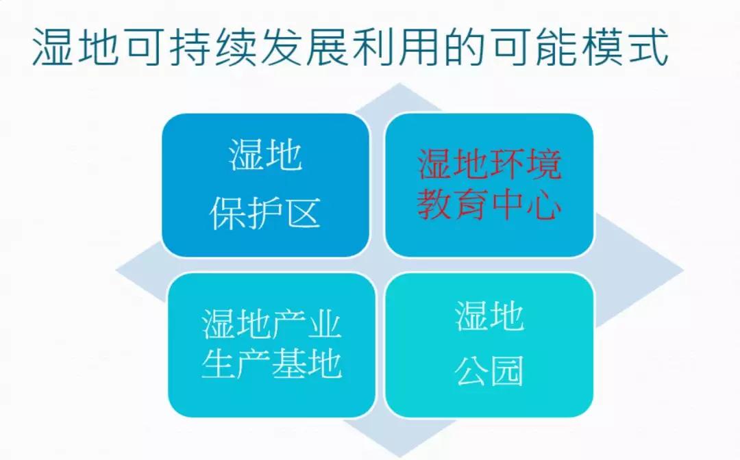 我今天想跟各位分享的是湿地可持续发展的可能模式,我会就现况跟各位做一个简单的报告。湿地可持续发展模式,包括湿地保护区、湿地产业生产基地以及湿地公园。非常开心,我们也开始思考第四个重要的可持续发展模式,这就是湿地环境教育中心。我认为湿地环境教育中心跟湿地公园还是存在一些差别,这主要体现在更加细腻的教育工作上,湿地公园的重点在于为民众创造一个空间跟区域,但是湿地教育中心着重的是怎样教育和引导公众认识我们的湿地环境。