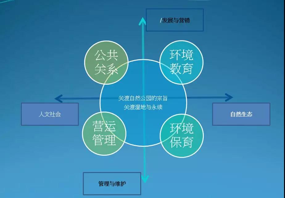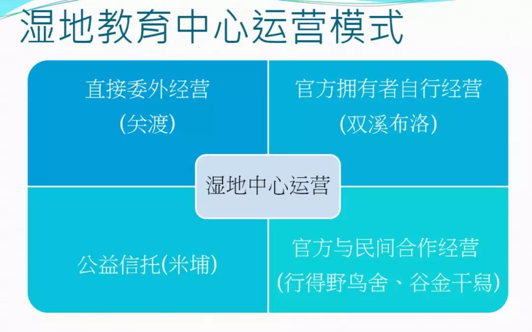 比如,官方拨付经费委托第三方机构来做教育相关的工作。它们可能不用像关渡、米埔得承担全部的管理运营责任,因此压力也没那么大。上面说的这四种模式涉及到湿地中心的可持续发展,会产生不同的策略跟方向。