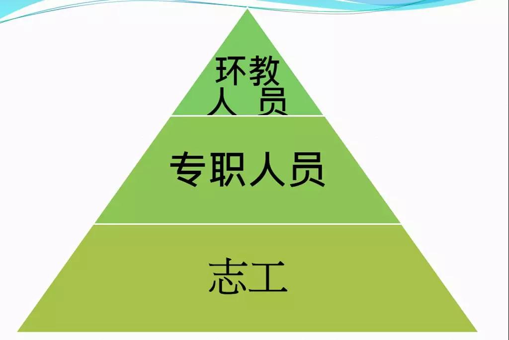 所以我们的概念有一点像金字塔,最核心的还是环教人员,教育者必须领导相关的一些支持人员,比如保安、保洁、施工人员或者志愿者。如果你发现上面有很好的环境教育人员,中间有非常棒的专职人员,最后面志工再参与进来,这样下来,场域人员的稳定度会非常的好。