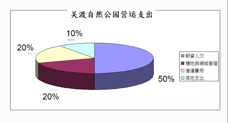 因为要谈可持续发展,那经费永远是一个绕不开的话题。这个图是关渡的支出计划,但是仅供参考,因为每个中心的模式都不一样。以关渡目前的现况来讲,人员永远是最重要的投资跟推动工作,这个已经算低的了,我所知很多的湿地公园人员可能占了70%到80%的运营成本。